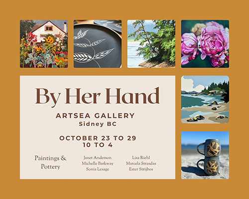 October 23-29, 2026 “By Her Hand” features the paintings and pottery of six local artists: Michelle Barkway, Sonia Lesage, Lisa Riehl, Janet Anderson, Marcela Strasdas and Ester Strijbos.