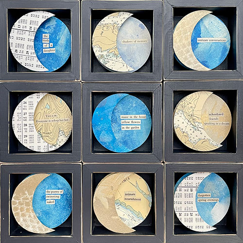 MoonTide is a playful, multimedia exploration of two interconnected aspects of “island time”: the ever-changing magic of the moon and the constant rhythm of the tide.  MoonTide is more than a collection of works by three individual artists. The show celebrates the joy, surprises, and connections that arise when artists work together, sharing and combining their ideas and their creative process.  Monica’s words, including an original song she wrote for the show, form the heart of the exhibition, giving life to and directly inspiring many of Ester’s and Janny’s pieces.